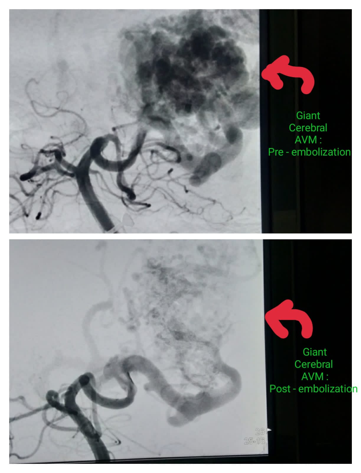 Pre procedure- Giant cerebral AVM Pre embolization & Post Embolization procedure- Giant Cerebral AVM Post embolisation.