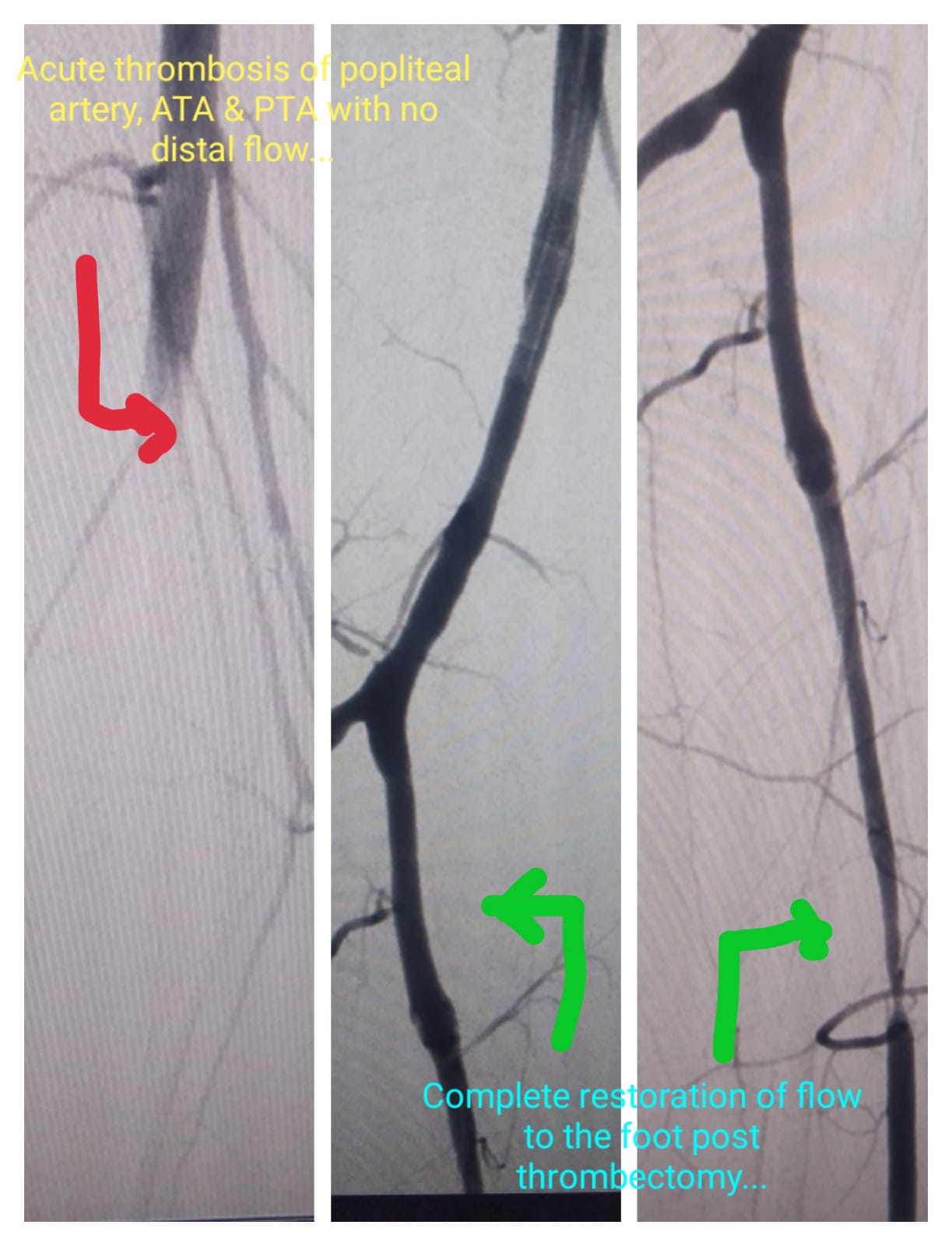 Deep Vein Thrombosis (DVT) in left leg. Pre Procedure - No Flow & Post Procedure- Complete flow restoration post thrombolysis & Thrombectomy.