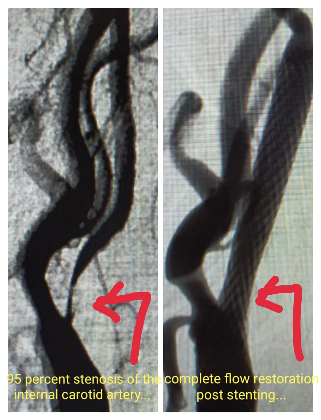 Carotid Artery Stenting Procedure Pre procedure - 95% stenosis in Internal Carotid Artery Post Procedure- Deploy Stent & restore complete blood flow