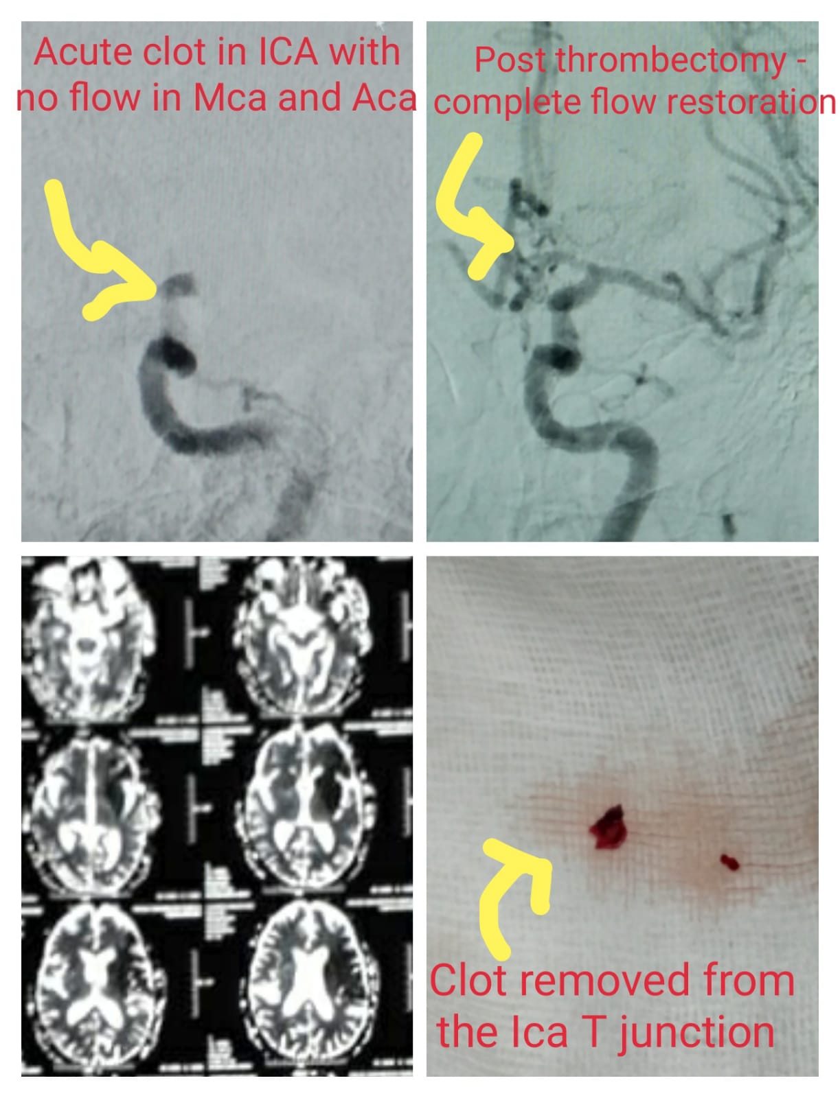 Thrombectomy Performed in Internal Carotid Artery. Pre-procedure- Acute clot in ICA with No flow IN MCA & ACA, Post Procedure- Complete blood flow restoration post Thrombectomy & Clot removed from the ICA T JUNCTION
